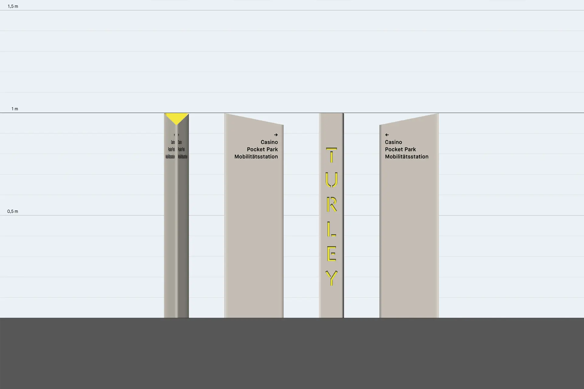 Das Leit- und Orientierungssystem besteht aus einer individuell für Turley entwickelten Familie nutzungsfreundlicher Design-Objekte, die informieren, durch das Quartier leiten und ihm eine visuelle Identität mit hohem Wiedererkennungswert verleihen.